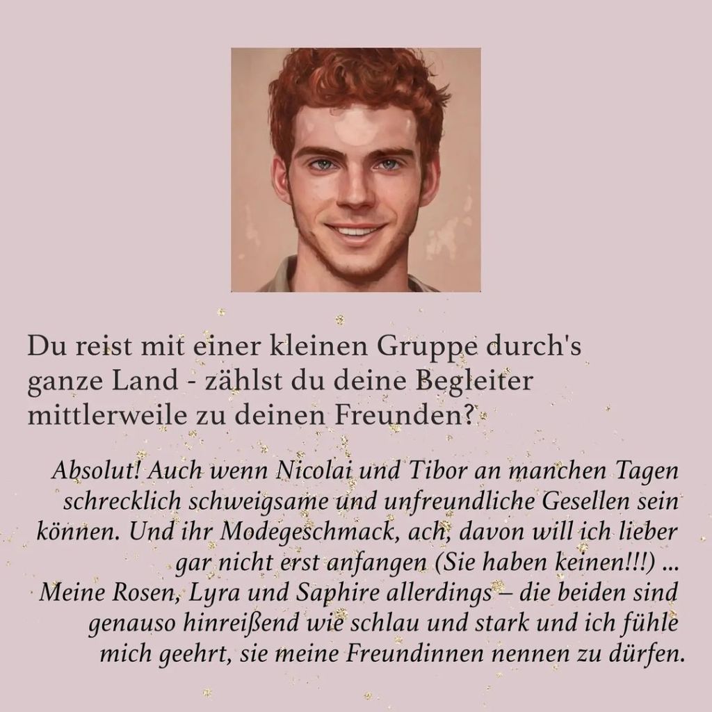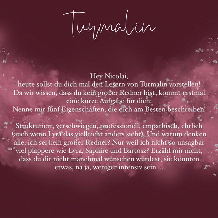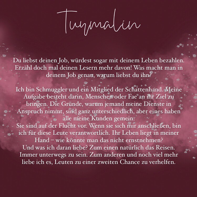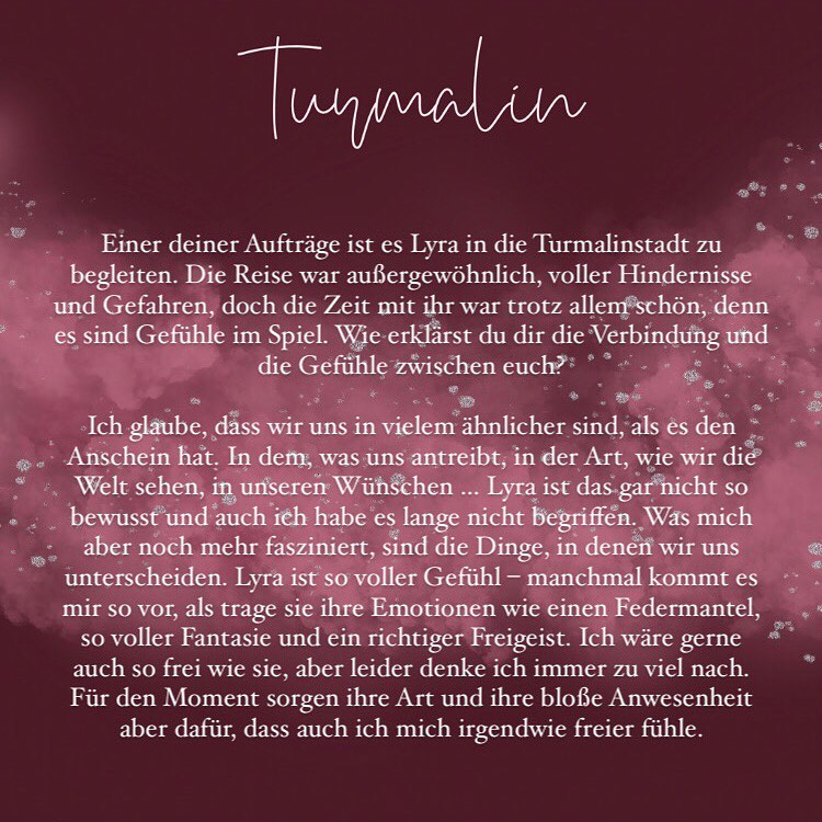 In Turmalin begleiten wir eine ziemlich schräge und auch magische Reisetruppe auf ihrem abenteuerlichen Road-Trip … um die einzelnen Charaktere besser kennenzulernen, haben fünf Bloggerinnen Interviews mit ihnen geführt. Klickt euch durch die Slideshow, um ihre Fragen und die Antworten der Protagonist*innen zu lesen: